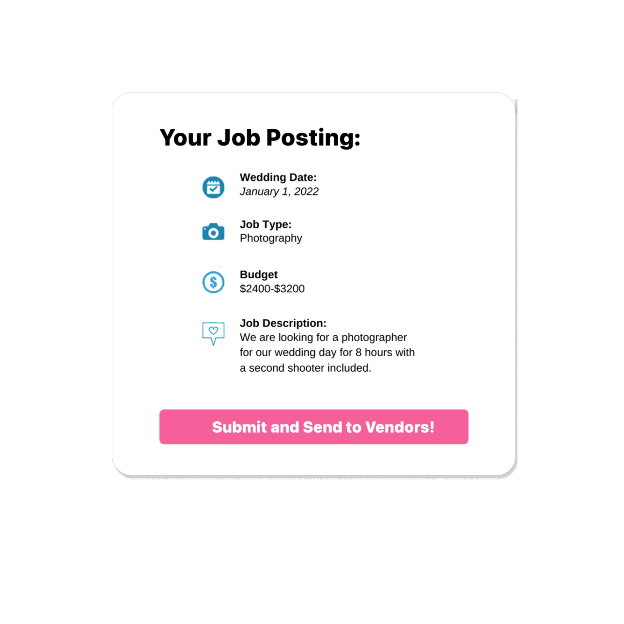 Post your specific wedding day needs and get qualified bids in minutes from trusted vendors.